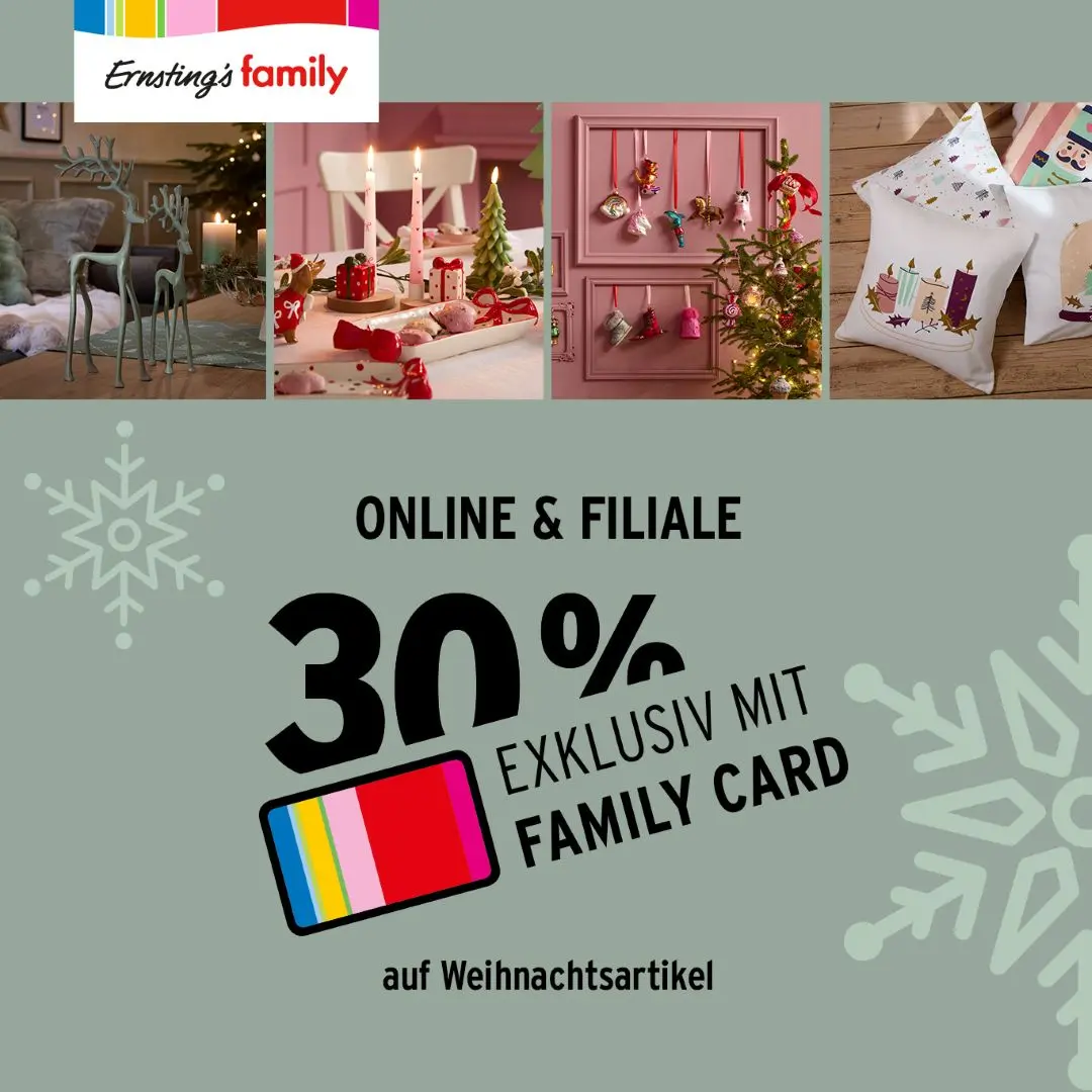 Bei Ernsting’s family gibt es vom 02. bis 04. Dezember 30% auf Weihnachtsartikel exklusiv mit der Family Card.